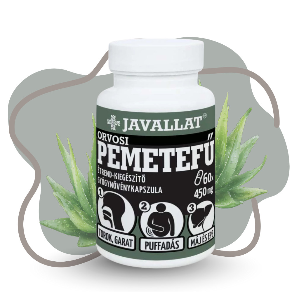 - Az orvosi pemetefű termék fogyasztásának szünetében az alábbi termékek fogyasztásával támogathatja egészségmegőrzését: JAVALLAT® Izlandi zuzmó, JAVALLAT® Kerti kakukkfű