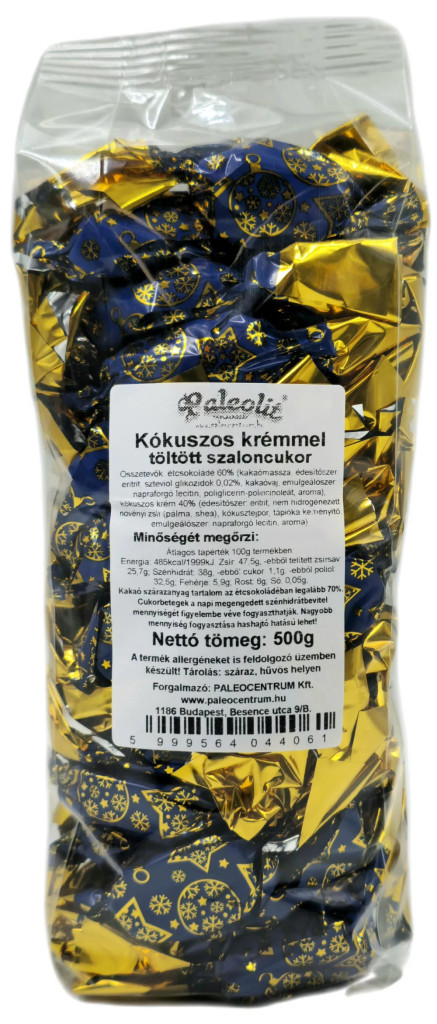 Összetevők: étcsokoládé 50% (kakaómassza, édesítőszer: eritrit(14%), kakaóvaj, emulgeálószer: napraforgó lecitin, édesítőszer:szteviol glukozidok(0,02%)), kókuszos krém 50% (édesítőszer: eritrit(20%), nem hidrogénezett növényi zsír (pálma,shea) , kókusztejpor (10%), tápióka keményítő, emulgeálószer: napraforgó lecitin).